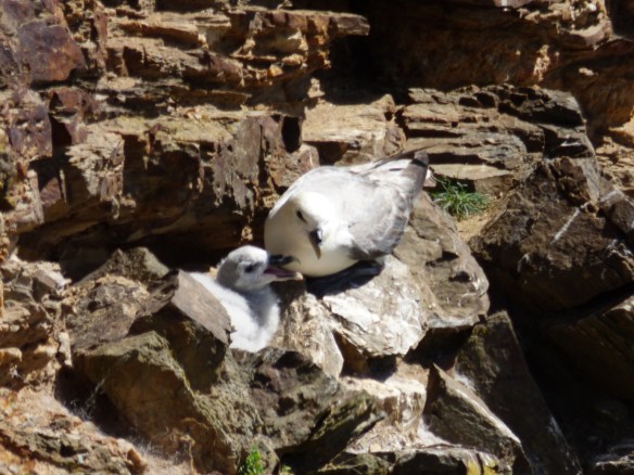 We could also see a couple of fat Fulmar chicks on ledges, too. These are the slowest-growing of any of the birds that breed here and it will take a Fulmar chick about seven weeks from hatching to its first flight. By contrast, all of our terns and gulls will do this in a month or less…but, then again, it’s a lot more dangerous nesting on the ground than on a cliff, and the quicker you can fly, the better!