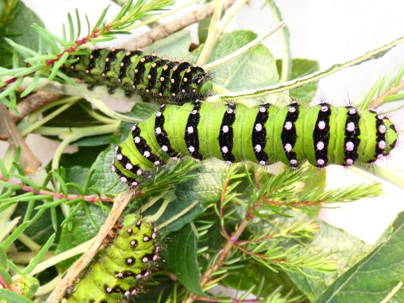Of course, many of us probably encounter butterfly and moth life cycles at an early age, with books like ‘The Very Hungry Caterpillar’. Well, we also had some impressively hungry caterpillars to show everyone, the startlingly green-and-black striped Emperor Moth caterpillars. Resembling nothing so much as miniature motorised gherkins, these finger-sized caterpillars were almost ready to pupate. They turn into a large and beautiful moth which only lives for about a week – remarkably, the adults have no mouthparts, so can’t actually feed – so they have to do all their eating as caterpillars!