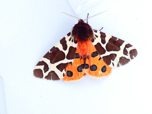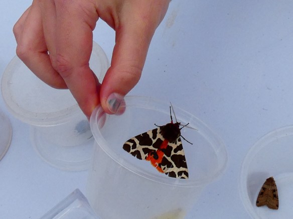 One of the commonest moths – and most easily recognised – is the Garden Tiger. With its black and white upperwings and red underwings, this is an unmistakable beast – and always a real crowd-pleaser on a moth morning.